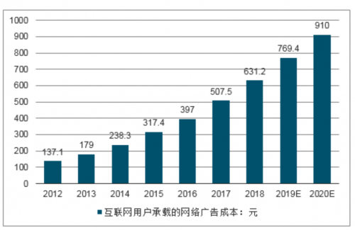 (網絡公開數據:2012-2020年中國互聯網單用戶所承載的網絡廣告成本)