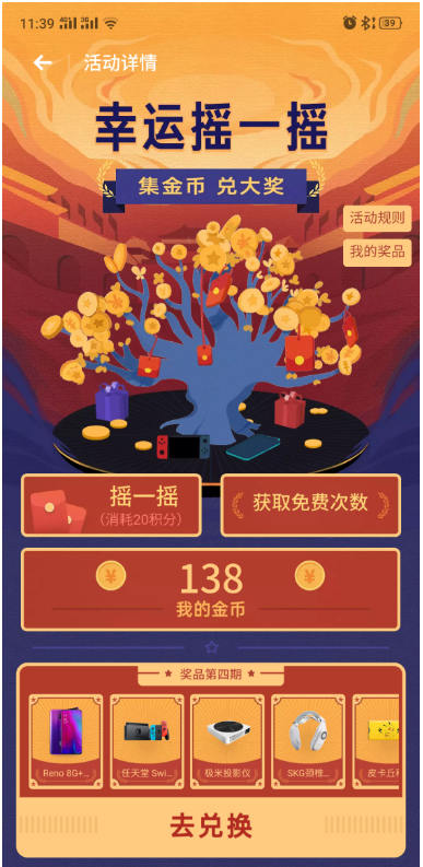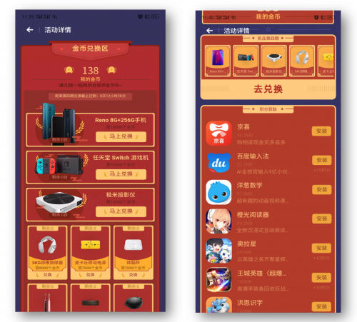 用戶通過“幸運搖一搖——集金幣·兌大獎”活動,參與完成應用瀏覽、專題瀏覽、應用下載等任務,即可獲得搖一搖機會。搖一搖獎品包含紅包、虛擬金幣、應用優惠券等,而通過積累虛擬金幣,則可以兌換更超值的應用優惠券、手機話費,以及更大的實物獎品,如OPPO Reno手機、任天堂Switch游戲機等。