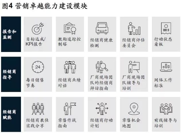 車企還應該為經銷商提供一系列標準工具、模板和最佳實踐參考,以幫助他們快速提升零售能力。圖4列出了多項營銷能力建設模塊。