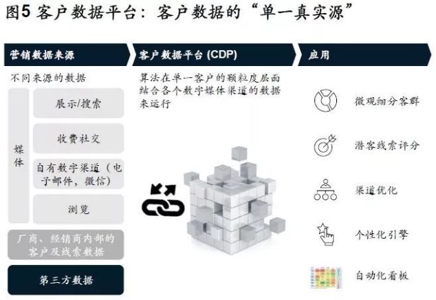 在重新思考組織與能力建設的同時,車企也需要考慮如何搭建新時期的技術平臺。盡管在過去幾年林林總總出現了很多解決方案,我們認為大部分在實際提升效率,改善經營等方面的效果都有待驗證。當車企逐漸過渡到第三階段深度參與零售時,眾多技術平臺中比較基礎的將是客戶數據平臺(CDP),該平臺將單個客戶數據聚合集中到中心數據庫。CDP確保汽車廠商不僅可收集數據,還可將數據結構化以便推動銷售和營銷活動。圖5列出了CDP的主要組件。我們認為車企既要擁抱技術平臺,又要避免為了“看起來先進”而引入數據和技術,如何取得平衡也是制勝的關鍵所在。