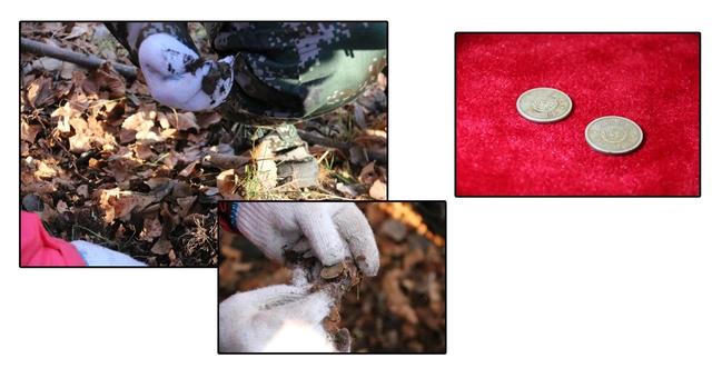 進入老黑河遺址區域,首先看到的就是此前我們曾多次介紹過的水井,循上望去便是用石頭壘的整齊的石墻和堡壘,即為主城。"快來看!"隨著宣傳部長孟凡迎的一聲驚呼,考察組一行圍攏到一起,扒開落葉,一處洞口得見天日,定睛一看是個炕灶,沒有完全坍塌的原因竟是內有鐵質火車零件支撐。像是天意昭昭,又像是一分耕耘、一份收獲,老黑河遺址像是一份待啟的寶藏,把一件件物品挾裹出來,還原歷史與真相。此次考察,在2萬多平方米的主城墻上,長出了一株百年大青楊,距地面1米半處掛了斷鐵絲網,看來樹下還埋著鐵絲網,同行的財政局長崔賢凱在那扒拉,我怕他扎手,就過去幫他扒土,一下露出了兩枚"大滿州國銀幣",年份為大同二年壹角硬幣、康德五年壹角硬幣。在打石場處,又揀到鞋跟爛沒,鞋底脫落的女式半高跟皮鞋一只,結合前不久發現的生產于廣州的民國時期"歐陽戊隆香草油"高級化妝品,使我們一行百思不解,1940年日軍把鐵路修到這,僅僅是為了伐木掠奪資源嗎?他們為什么要如此嚴密設防?為什么撤退時又放火毀滅這里?我們在主城下,占地千平的前沿指揮所,發現了一口井,井周邊用木板搭橋,大部分板子被燒焦了,可見當時火勢之猛。此行,還拾有水壺殘骸一件、平底鍋一個、籮底網一張。對比以往生活、戰斗物資的發現,此次偽滿錢幣的種類擴增,值得探究。除物品外,在老黑河遺址還發現兩處深約1.5米的地下洞口,四周腳跺為清脆的空心聲,似地下排氣口,似有地下工程,等待考古專家破解。