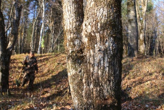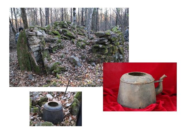 我們一行人下車步行,在崎嶇的山路中,發現了此行的第一個"寶貝"——榫卯結構的火車枕木。據文獻記載,1940年日偽將森林小鐵路修至老黑河遺址前后,對這一地區的木材進行采伐掠奪近五年之久。1945年,日軍撤退時放火將其燒毀。我們此行所走的山路,有數公里長的一段就是當年的鐵路,現在仍可見碎石底路基,而火車枕木的發現更是證實了這一點。枕木的發現,讓我們一行非常興奮,因為:這是原物,是歷史與真相!要把枕木保護收藏起來,一部分要在博物館展出;另一部分則要與筑路碎石一同在發現處展出,高度還原,讓游客和后人知道80年前日本人是使用什么路基,在東三省是用何種方式運輸掠奪物資的!
