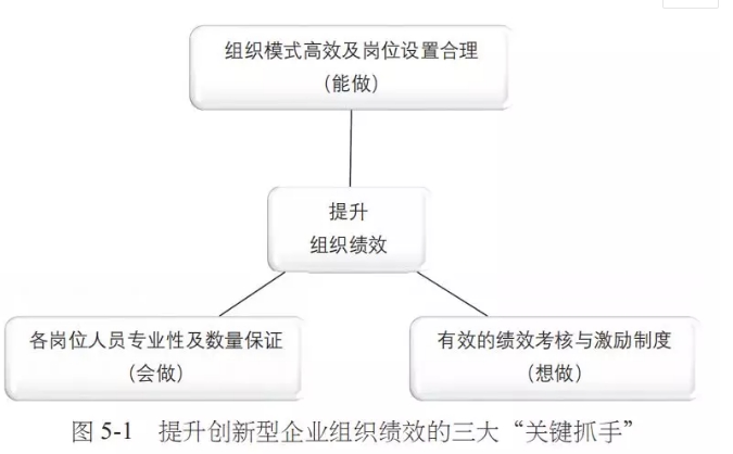提升組織績效的三大“關鍵抓手”:組織模式設計、人員專業性、績效考核與激勵制度,分別對應“能做”“會做”“想做”,如圖5-1所示。