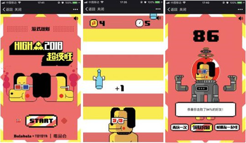 同時,巴拉巴拉與GIF藝術家Toyoya、唯品會聯合,共同推出一款超級旺H5小游戲。用戶在游戲中集齊“緣、吉、發、囍”這4種能量,即可憑游戲積分獲得199減10,299減20,甚至499-50的專屬紅包,通過有趣的體驗互動引導用戶進到活動專場。當他集齊 “緣、吉、發、囍” 這4種能量之后,就正式變身成能量滿滿的“超級旺”了哦~
