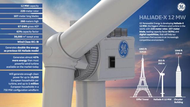 為了提高能源效率,通用開發的一款風力發電機,高度達到了 260 米,發電能力可達 12 兆瓦,為數以萬計的家庭提供電力。