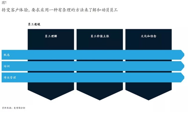 為了成功實施這個同時面向客戶和員工的變革項目,該銀行組建了一支跨學科轉型團隊,匯集了包括流程工程師、條線經理以及人力資源專員在內的各類專業人才。除了構建一個框架來勾勒出色客戶體驗的輪廓之外,該團隊還開發了一個覆蓋了所有員工體驗的總體框架(見圖1)。為了轉變員工的工作體驗、改善一線員工與公司和客戶之間的交流與銜接狀況,該團隊采用了一體化、綜合性的干預方法:通過焦點小組討論、個別訪談等定量和定性調查研究方法深度洞察員工需求;重新設計員工價值主張;大幅整改人力資源實踐的關鍵環節,例如人才的招聘與甄選、能力建設、績效管理;并開展了一系列旨在構建“以客戶為中心”的企業文化的舉措,包括推廣企業符號(例如彰顯企業個性的吉祥物、員工名牌和文具)、舉行儀式和慶典(例如組織員工與管理層共進早餐)、在領導層年度大會中加入頒獎環節、設立一個同僚表彰門戶。管理層通過反復傳遞訊息和鼓勵某些行為(例如展現銷售行為的公開和透明)來強化這些工作。