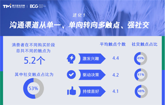 社交時代以前,企業(yè)與消費者之間的互動較為單一,主要以企業(yè)向消費者單向宣傳為主,一般由付費媒體、大眾廣告和銷售終端等單個或幾個渠道組成。而今天消費者不再被動地接收營銷信息,購買過程變得異常復(fù)雜和碎片化,每個決策階段都要經(jīng)歷多個觸點。以激發(fā)興趣、驅(qū)動決策、持續(xù)喜好三個階段為例,消費者平均要接觸5.2個觸點,并且這些互動呈現(xiàn)高度社交化的趨勢,其中53%為社交觸點。