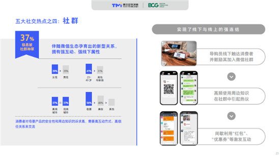 看似組織簡單的社群卻具有很強的帶貨能力,調(diào)研顯示37%的消費者受到社群影響。女性消費者(39%)略高于男性(35%),25-40歲年輕人(41%)熱衷于社群互動,領(lǐng)先其他年齡層。從品類上看,母嬰(56%)和美妝(40%)行業(yè)大幅領(lǐng)先,究其原因,我們認(rèn)為消費者對母嬰產(chǎn)品的安全性和周邊知識的訴求高,需要高互動、高信任關(guān)系來交流,而社群正好提供了這樣一個空間。
