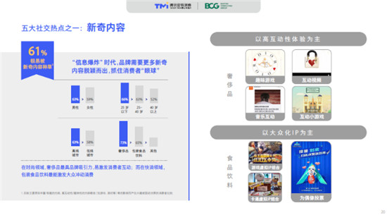 這是一個信息爆炸的時代,消費者欣賞水平不斷提高,口味越發(fā)挑剔,對營銷內(nèi)容的警惕性越來越強。每個企業(yè)都在進(jìn)行內(nèi)容營銷,而他們的競爭對手不單單是同行友商,也需要和各種娛樂內(nèi)容搶奪消費者的注意力和時間。如果品牌營銷內(nèi)容無法在幾秒鐘內(nèi)吸引住消費者,那么它就流失了機會。因此品牌需要更多新奇內(nèi)容才能從同質(zhì)化的競爭中脫穎而出,抓住消費者的眼球。我們的調(diào)研明顯支持了這種判斷,有61%消費者表示會被新奇內(nèi)容種草。進(jìn)一步細(xì)分,男性(63%)對新奇內(nèi)容的接受程度略高于女性(59%),而年輕人(25歲以下66%)明顯高于年長消費者(40歲以上52%)。而從行業(yè)上看,奢侈品(73%)和食品包裝飲料(65%)是最適合新奇內(nèi)容的品類。