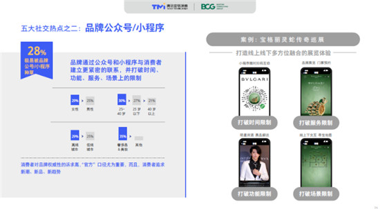 低頻、高互動產(chǎn)品例如奢侈品、美妝和時尚鞋服類,微信體系特別是品牌公眾號以及KOL會對消費者起到較強的激發(fā)作用。由于此類產(chǎn)品一般單價較高,消費者希望能得到官方的權(quán)威信息或信賴意見領(lǐng)袖的代言推薦。此外,由于此類產(chǎn)品購買決策鏈較為復(fù)雜,消費者往往期待在購買前獲得更好地指導(dǎo)和體驗,因此線下門店和品牌導(dǎo)購應(yīng)成為企業(yè)投入的重點。