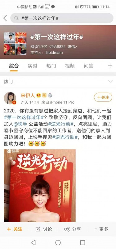 除此之外,快手與超過20家藍V、明星共同在微博平臺發起#第一次這樣過年#的話題討論,引發網友熱情互動,眾多網友紛紛在話題下參與討論,與大家一起分享過年故事。