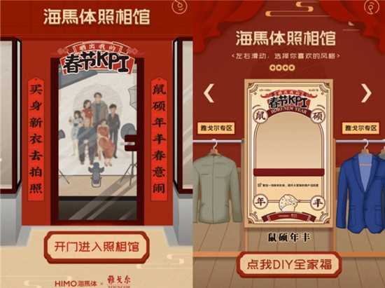 點開鏈接,就可以看到海馬體照相館的門口,“鼠碩年豐春意鬧,買身新衣去拍照”的春聯緊扣產品又不失趣味。點擊“開門進入照相館”,大家就可以穿上雅戈爾DIY全家福了。