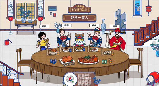 百事可樂同時還合作了《潮流合伙人》bro的IP形象,結合潮流元素與傳統春節聚餐場景,打造年輕人喜歡的微信小程序互動,并利用社交平臺裂變,有效拉近品牌與消費者之間的距離。