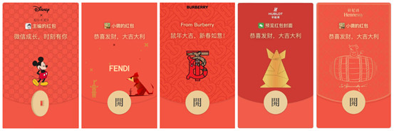 許多國際品牌針對農歷鼠年進行設計,通過將新春祝福與品牌理念融合,拉近與用戶的距離。其中,GUCCI 將迪士尼明星米奇作為紅包封面主角;FENDI 則將新春限定系列的萌鼠形象放入紅包封面;Burberry 紅包封面上,一只貴氣鼠與logo巧妙結合;HUBLOT宇舶表紅包封面上,菱角分明的金色老鼠形象個性十足;Hennessy 軒尼詩在紅包封面上呈現了一只腳踩干邑橡木桶小萌鼠。