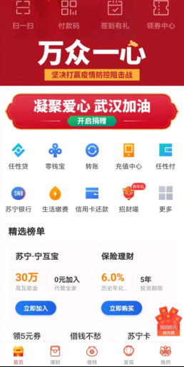一方有難,八方支援。早在1月26日,蘇寧金融就緊急上線“抗擊新型肺炎疫情”公益項目,為大眾提供便捷捐款通道。登陸“蘇寧金融APP”,點擊首頁banner圖,即可一鍵開啟線上捐贈,為疫情防控貢獻一份愛心、一份力量,為武漢加油。