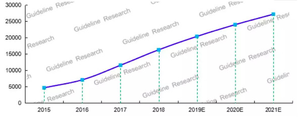 2015-2021年中國OTT TV機頂盒保有量(累計出貨量)發展預測示意圖(來源:格蘭研究)