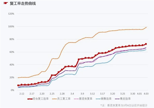 根據(jù)中國(guó)汽車(chē)流通協(xié)會(huì)統(tǒng)計(jì),截至4月3日,在調(diào)查的149家汽車(chē)經(jīng)銷(xiāo)商集團(tuán)共8,721家汽車(chē)4S經(jīng)銷(xiāo)商中,門(mén)店復(fù)工率98.8%,日常到店客流是正常時(shí)期的66.4%,銷(xiāo)售效率和售后效率分別為63.8%和66.6%,綜合復(fù)工率已經(jīng)達(dá)到72.50%。與此同時(shí),武漢經(jīng)濟(jì)技術(shù)開(kāi)發(fā)區(qū)已經(jīng)有200多家汽車(chē)整車(chē)及零部件企業(yè)復(fù)工復(fù)產(chǎn)。