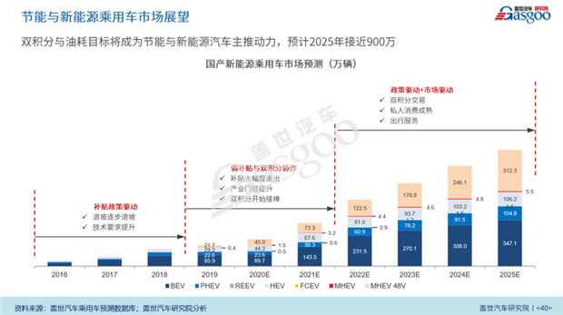 一方面,新能源車市場潛力巨大。蓋世汽車研究院發布的2019年新能源乘用車市場總結與趨勢展望中預測,相關政策的推動下,再加上私人市場和出行服務市場的成熟和壯大,新能源乘用車的市場規模后續幾年會有大幅度的提升,預計到2025年會接近900萬輛。