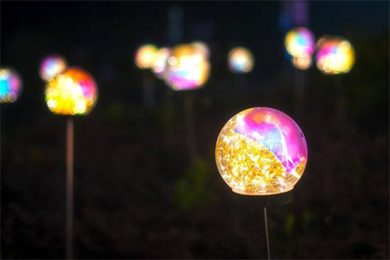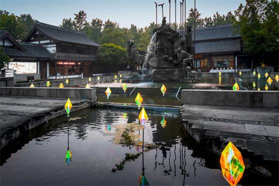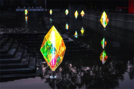 在景區內的水池中,以繽紛琉璃晶石進行水池區域氛圍營造,迎合周邊DP裝置主題,晶石形燈光置放水池之中,夜色中,水池區域在晶石燈飾的閃爍下瞬間提亮,抓人眼球。
