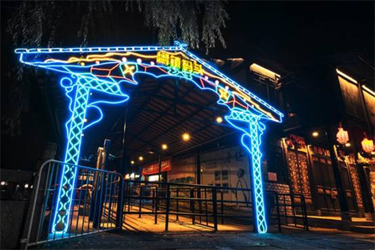 在魯鎮碼頭,夜空彩虹采用柔性燈帶,沿著碼頭牌坊輪廓打造夜景燈飾,以熒光藍色為主體,展示“魯鎮碼頭”地標信息,指引夜游的游客在此處購票登船。