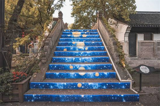紹興柯巖景區河網密布,隨處可見河流與古橋,步行至魯鎮景區的近河畔處,古香古色的橋梁靜臥河面,恬靜不失雅趣。在橋梁階梯處,燈畫帶來了美麗的星空效果。
