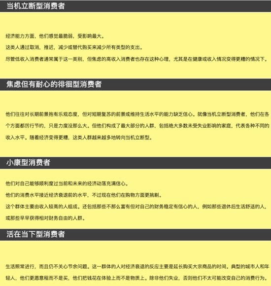 所以,現在你的品牌面對的消費者是今天分析的哪一類?可以對號入座,并試著看一看哪一種策略更有效。不論如何,在經濟衰退期雖然消費需求放緩,但此刻的投入或許是對未來的投資。