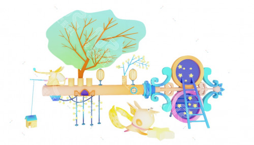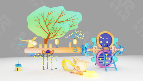 目光所至,最先看到的是飛飛鼠父子的“鑰匙花園”,鑰匙改造而成的平臺正是它們工作的地方,父親“藍鼻子”正在努力地釣起一間房子!真是一個巨大的挑戰。而兒子“三眼鼠”正在忙碌地改造著。