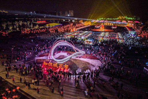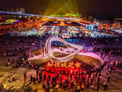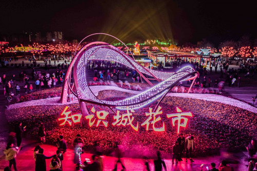 今年廣州春節花市期間,黃埔知識城廣場,由勵豐、夜空彩虹共同打造的一座總高度7米,最大縱深及寬度14.3米的新媒體燈光景觀雕塑「莫比烏斯環」 聳立。