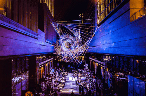 交替、平行、螺旋、縱深、流動…… 設計師通過幾何線條的形態變幻,使得「無限」 這款藝術燈光新媒體裝置與眾不同,營造出神秘的氣質;漸變色在裝置中的交替呈現又讓它秀出活力的一面,隨著音符跳動、帶動著現場的游客與行人加入到這場光影秀中。