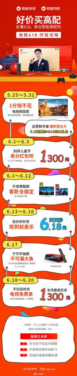 伴隨來六一兒童節打響的618購物狂歡季風風火火的來臨。為了給消費者更好的購物體驗,微鯨電視已經提前開啟了618活動。5月25日—6月20日,分為六個節點促銷,最高下單立減1300元。想買一臺好電視放客廳、臥室的消費者,只要實時關注微鯨官網/微鯨京東自營店/微鯨天貓旗艦店/蘇寧易購,就可以快、準、狠的下手搶購哦。