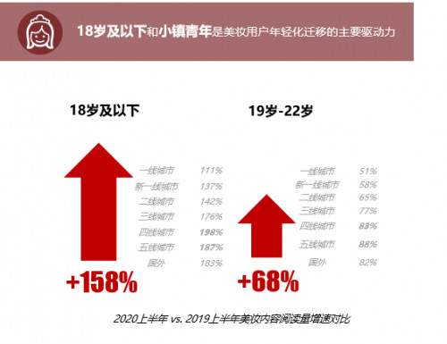 隨著社區平臺和美妝UGC內容的發展,對美妝內容的消費人群趨于年輕化,其中18歲以下群體對美妝內容的消費量提升158%,護膚和個人護理的內容消費漲幅高達241%和239%。