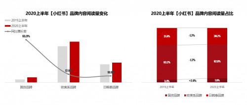 數據顯示,在2020年上半年小紅書平臺上國貨品牌內容消費量同比大幅增長65.9%,遠超歐美系品牌和日韓泰品牌。從內容總量占比來說,歐美系品牌依然占據絕對優勢,但國貨品牌內容消費量占比增加明顯。