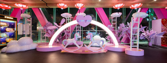 而廣州富力海珠城主題燈光氛圍亮化,則是以具有神秘感的獨角獸作為設計靈感,通過創意獨角獸雕塑,為商場打造了一個奇妙且可愛的空間,為消費者提供了一個全新網紅打卡點。