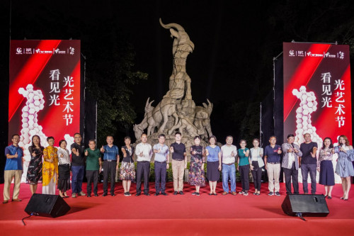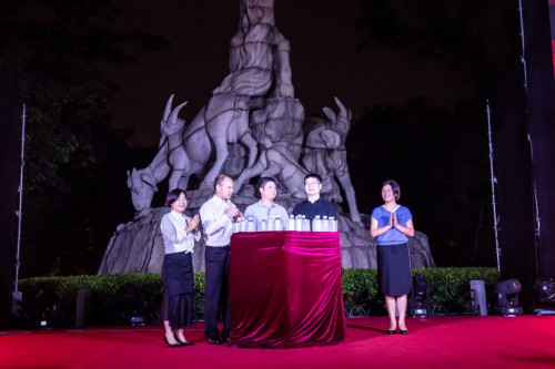 開幕式上,來自廣州市林業和園林局副局長陳迅、廣東廣播電視臺副臺長曾少華、廣州市文化廣電旅游局副局長柯顯東、廣州市越秀公園主任王艾君和夜空彩虹集團總裁杜海燕通過由夜空彩虹設計的心型Feng巢啟動裝置,共同啟動此次光影大秀,并點亮了位于越秀公園東門廣場的活動主裝置《琉光·五羊》。