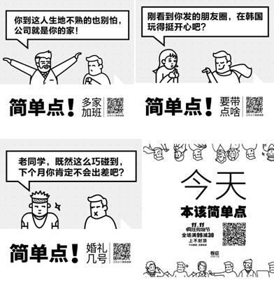 當大家都在拼晚會、斗直播的時候,卷皮電商背道而馳呼吁簡單,拒絕套路,就像雙11風潮里的一股“清流”。[NextPage]“簡單點”的主題結合生活中常見的復雜情景,用醒目的簡筆畫喊出了“今天,本該簡單點”的態度,最后“全場滿99減30”的促銷活動信息也自然而然被人們所記住。