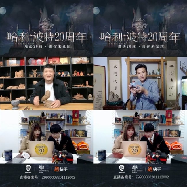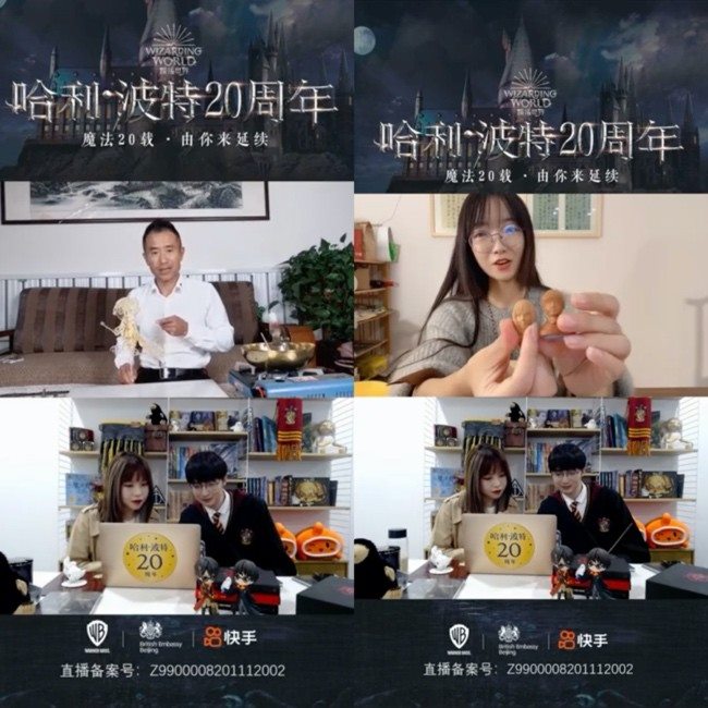 11月7日,快手與華納兄弟公司合作推出了“哈利·波特20周年”直播活動,慶祝“哈利·波特”系列中文圖書進入中國20周年。直播中,四位快手手藝人創作了以哈利·波特為主題的泥塑、糖畫、核雕、鼻煙壺內畫等作品,參與了八部“哈利·波特”系列電影制作的道具設計師Pierre Bohanna也在快手向網友們揭秘了電影幕后那些不為人知的故事;英國駐華大使及總領事們隔空接力,用豐富有趣的活動助力此次周年慶典。