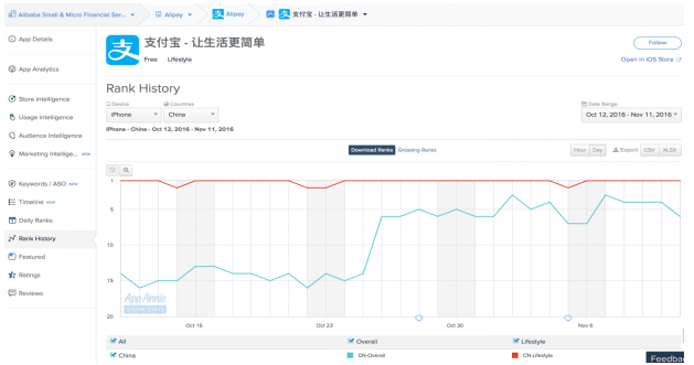 根據App Annie,螞蟻花唄作為阿里巴巴的金融信用服務,由于為在今年 “雙十一”購物的阿里巴巴消費者提供額外的信用額度而備受關注。活動從 10 月 18 日開始,截止到 11 月 12 日,螞蟻花唄共送出了 100 億元人民幣的信用額度。由于該信用服務主要通過支付寶提供,因此在 “雙十一”前夕,iOS 的 “螞蟻花唄”下載量激增。