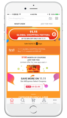 而App Annie在去年介紹過的國際批發平臺全球速賣通 (Aliexpress) 也證明了阿里巴巴正在全力將 “雙十一”購物節推向海外的移動消費者。該應用不但隆重推出 “雙十一”購物節專題,而且引入了大受中國消費者歡迎的新技術,例如視頻直播。