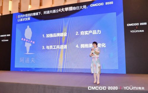 阿道夫市場總監 伍屯穎 與現場來賓分享道,在疫情期間阿道夫通過廣貨節、云擺攤、大咖帶貨等電商直播的方式,搶占品牌出圈的機會,從而化解危機。
