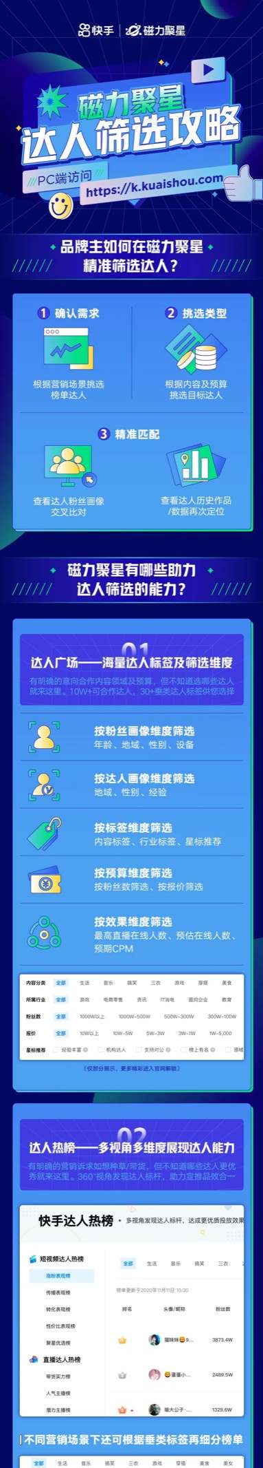 通過磁力聚星的多維度工具,我們可以看出,在廣告投放最為重要的前期篩選環(huán)節(jié),磁力聚星已經(jīng)可以提供全方位多維度的選擇工具,從數(shù)據(jù)維度定量分析,幫助客戶解決前期篩選環(huán)節(jié)的盲目性,為廣告投放提供探照燈,讓客戶清晰、明確地選擇快手投放。
