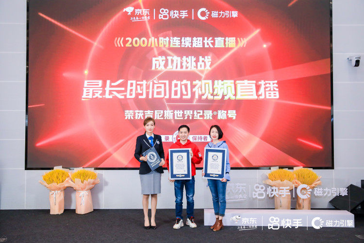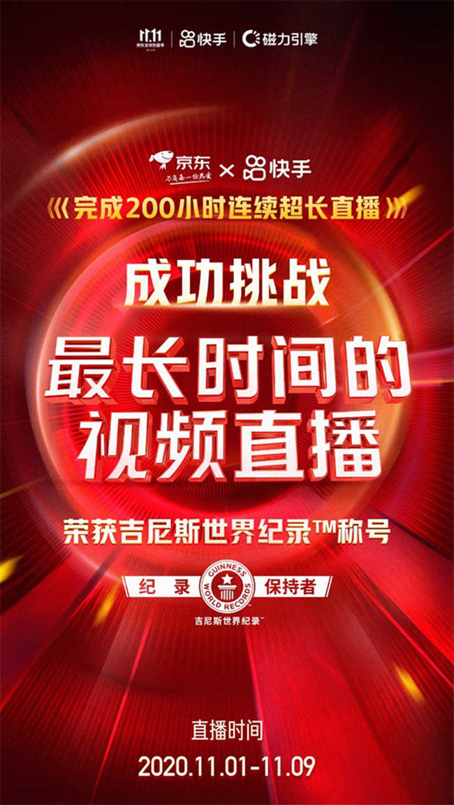 據(jù)悉,從11月1日下午16時0分0秒起,至11月9日晚24時0分0秒,在快手服務(wù)號@京東(ID:1912700614)直播間,舉行了連續(xù)超長帶貨直播活動,最終以有效時長200小時整,成功刷新此前由美國Hulu公司創(chuàng)下的161小時11分32秒的原紀(jì)錄。