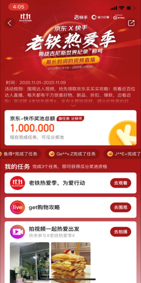 眾所周知,吉尼斯世界紀(jì)錄?是具有65年歷史的全球紀(jì)錄認(rèn)證權(quán)威機(jī)構(gòu)。本次活動快手和京東通過與世界級IP進(jìn)行強(qiáng)綁定,為打造今年11.11的營銷爆款案例奠定了基礎(chǔ)。同時,在快手公私域流量的助推下,使活動熱度持續(xù)攀升,加之豐富的直播內(nèi)容和多元的垂類領(lǐng)域,極大地滿足了用戶的消費(fèi)需求,實(shí)現(xiàn)玩轉(zhuǎn)營銷+效果轉(zhuǎn)化的“雙豐收”。