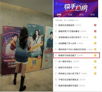 除了與粉絲進行最真實的互動,楊冪還在掃樓過程中隔空cue起了沈騰。之前在快手一千零一夜晚會上,穿著高跟鞋的楊冪扶沈騰扶了個寂寞,因此成了全網出圈梗。這次她在快手總部看見沈騰傾斜的海報牌,趕緊上前扶起,一掃"寂寞梗"的尷尬,還現場吐槽:"這和他本人差距也太大了吧。"在掃樓直播當晚,#楊冪終于扶到沈騰了#話題以1674W曝光量,登上快手熱榜榜第六。