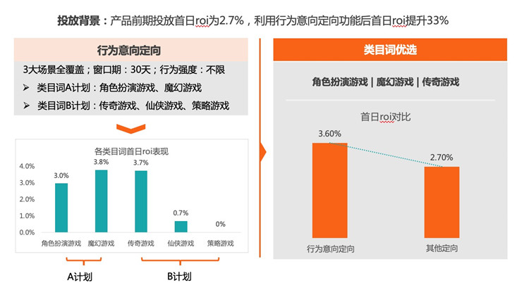 某角色扮演類游戲客戶在投放時利用三大行為場景進行目標人群圈定,同時收窄行為窗口期,首先實現精準覆蓋,之后通過多類目詞優選,選擇關聯度最高的五大游戲類目詞,制定AB計劃進行多級精細化類目詞測試,選取首日ROI效果最高的三大類目詞進行投放,最終實現相較于前期2.7%的投放ROI。綜合來看,使用“行為意向”定向功能后,該客戶的投放首日ROI提升約33%。