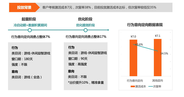 對于注重效果轉化的游戲行業客戶來說,留存率是和激活成本同樣重要的指標。近期,一游戲客戶通過“行為意向”定向功能,在保證激活成本的情況下,有效提升了留存率。該客戶通過利用行為意向+三大關鍵因子定向功能,根據不同營銷階段有針對性地制定了投放策略。