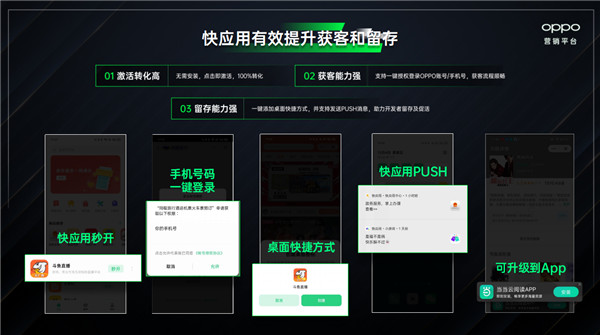 快應(yīng)用作為終端媒體特有的應(yīng)用場景,具備無需安裝、即點即用的特性,能夠在廣告投放和業(yè)務(wù)轉(zhuǎn)化流程中有效提升效率。例如,快應(yīng)用可以點擊即激活,省去下載和安裝的流程。另外還可以支持創(chuàng)建桌面快捷方式,并可以在后續(xù)升級為App,完成轉(zhuǎn)化。為了幫助客戶快速遷移,平臺還支持使用遷移工具從小程序零成本直接轉(zhuǎn)移,降低營銷成本。