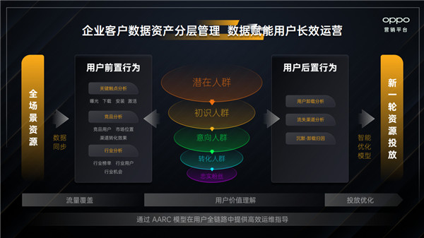 首先,在尋找目標受眾方面,Accurate(精準觸達)是OPPO營銷利用終端媒體系統(tǒng)優(yōu)勢所構(gòu)建的底層能力。在移動互聯(lián)網(wǎng)時代,終端媒體是信息與數(shù)據(jù)的海洋,其能夠打破App數(shù)據(jù)孤島,提供跨App的數(shù)據(jù)能力,并洞察用戶在系統(tǒng)中的搜索行為及意圖,在深度和廣度上同時提供精準的觸達能力。有了眾多的用戶數(shù)據(jù)來源后,經(jīng)過DataMiner智能大腦的整合,OPPO營銷構(gòu)建了豐富的標簽系統(tǒng)和人群畫像,從而應(yīng)用在客戶的預(yù)算分配、人群圈取、相似人群拓展等的場景,精準地指導(dǎo)廣告主決策。同時,基于AARC模型,對企業(yè)客戶的數(shù)據(jù)資產(chǎn)進行分層管理,幫助客戶進行數(shù)據(jù)運營分析,做出更科學(xué)的營銷決策,賦能用戶長效運營。