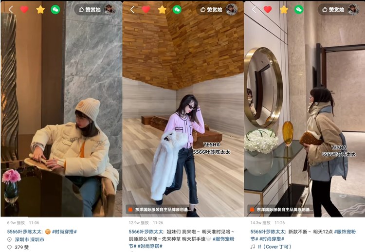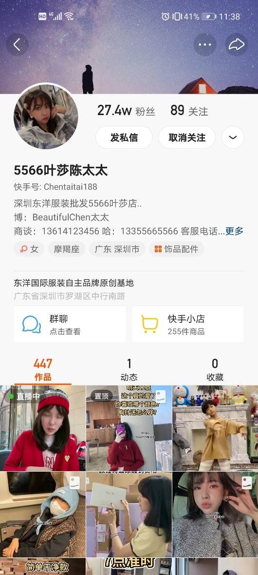 在進駐快手直播帶貨之前,蔣峰團隊在深圳從事服裝批發已有十三個年頭了。長年從事線下生意的他們,逐漸被今年直播帶貨的浪潮所吸引,并在9月份正式入局快手,開通了“5566葉莎陳太太”快手賬號。