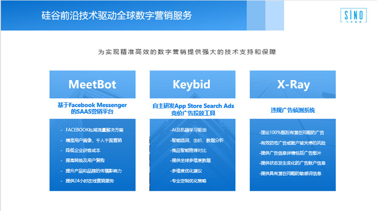 以及,基于Facebook Messenger的SAAS營銷平臺MeetBot、競價廣告投放工具Keybid、違規廣告偵測系統X-Ray等一系列技術產品和工具,充分利用技術和數據優勢,讓營銷對象更加精準、營銷工具更加豐富、營銷效果更加顯著,幫助企業打破出海營銷認知壁壘,拉動海外業務增長,提升全球品牌影響力。