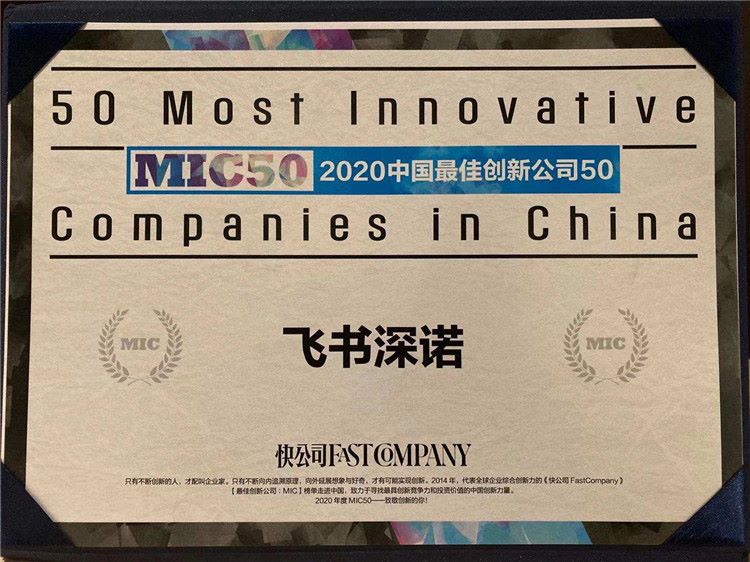 12月18日,《Fast Company》2020中國最佳創新公司50(MIC50)公布,飛書深諾集團位列其中。同時上榜的還有嗶哩嗶哩、釘釘、戴森、安克創新等行業龍頭企業。